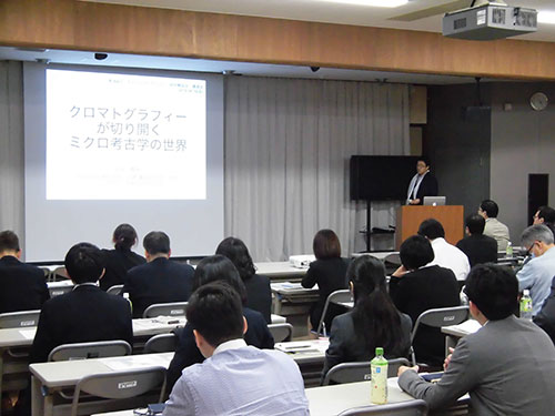 最後のご講演は、奈文研国際遺跡研究室室長庄田慎矢先生の「クロマトグラフィーが切り開くミクロ考古学の世界」であった。文字通り、顕微鏡レベルを超えたミクロの世界の考古学的研究についての講演であった。たとえば、遺跡から出土した土器の胎土内に残存している有機物を抽出し、ガスクロマトグラフィーによってさまざまなバイオマーカーの検出を試みており、Miliacinというキビに特有のマーカーの検出事例などが紹介された。また、個別脂肪酸の炭素安定同位体比測定をすることにより、土器による調理内容が地域や時期により明確に異なることも示された。現在は、極少量の土器粉末にテトラメチルアンモニウムを添加しての誘導体化熱分解GCと、ほぼ非破壊で測定できるDART-MS法に興味を持たれているとのことであった。休憩中も、土器片を前にしての分析法の熱心なディスカッションが続いていた。