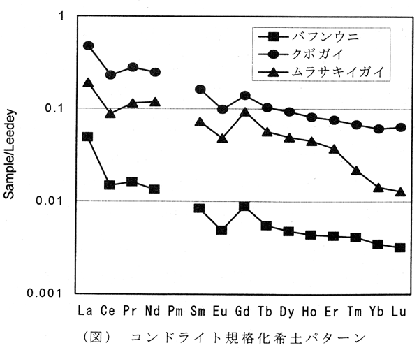本研究では鉄共沈法を用いて極微量の希土類元素を分離・濃縮した後に誘導結合プラズマ質量分析法(ICP-MS)で測定することによって、貝殻などの中のppb(1グラム中に10億分の1グラム)レベルの極微量の希土類元素を分析することができた。その結果を(図)に示す。この図は「希土パターン」と呼ばれ、試料中の14の希土類元素の各濃度を、基準として隕石の中の希土類元素濃度(隕石は地球全体の平均を代表すると考えられている)で割ってプロットしたものである。クボガイとバフンウニでは濃度は大きく異なるものの希土パターンの形はよく似ており、地殻の平均的な岩石の希土パターンに類似している。ムラサキイガイは重希土(原子番号が大きい希土類元素、図の右側部分)の形が異なることが分かる。この原因は、クボガイとバフンウニは岩についた藻類を餌としており、これに対しムラサキイガイは海水中のプランクトンを吸い込んで餌とする貝であるという食性の違いに関連しているものと考えられる。