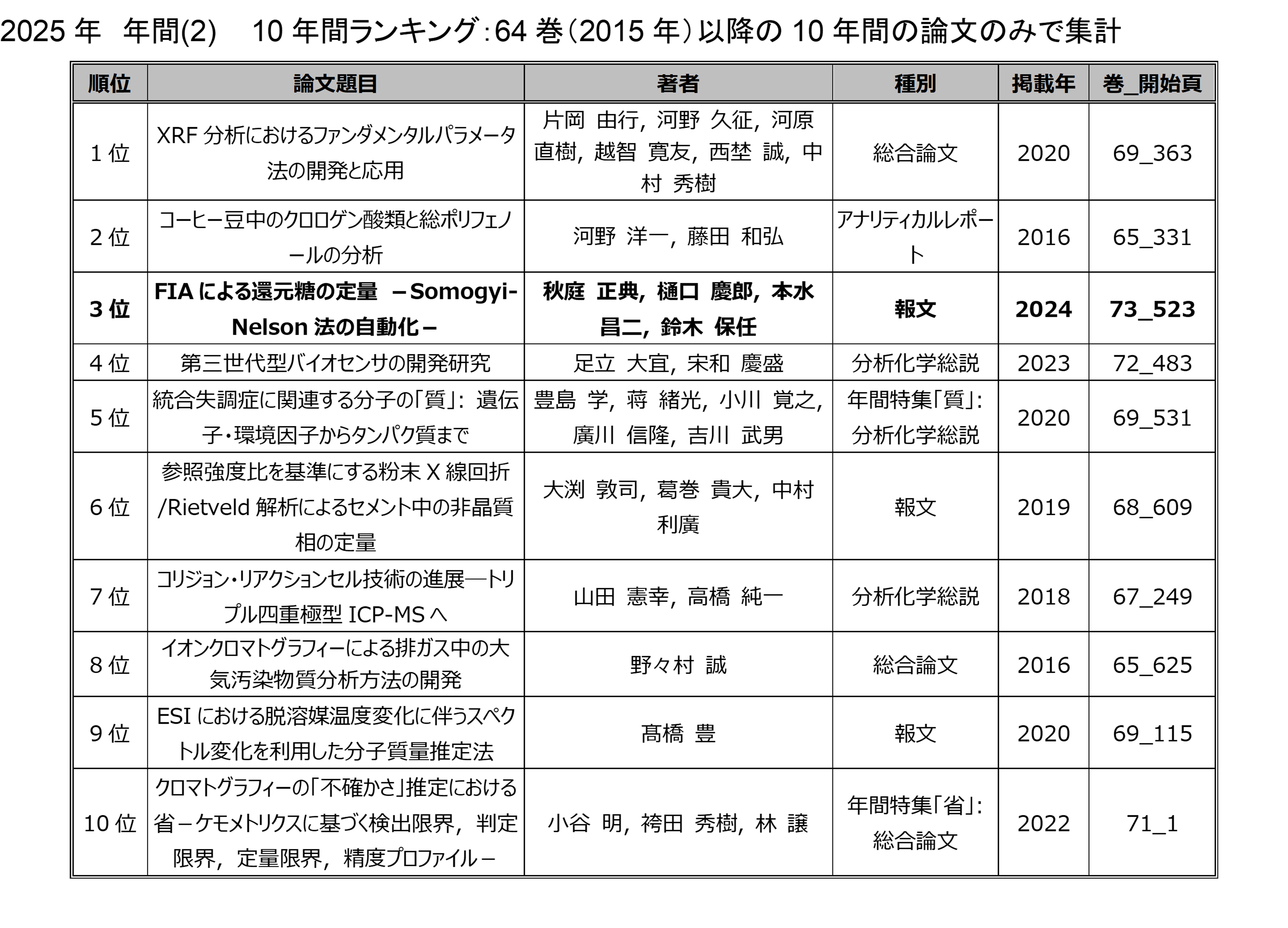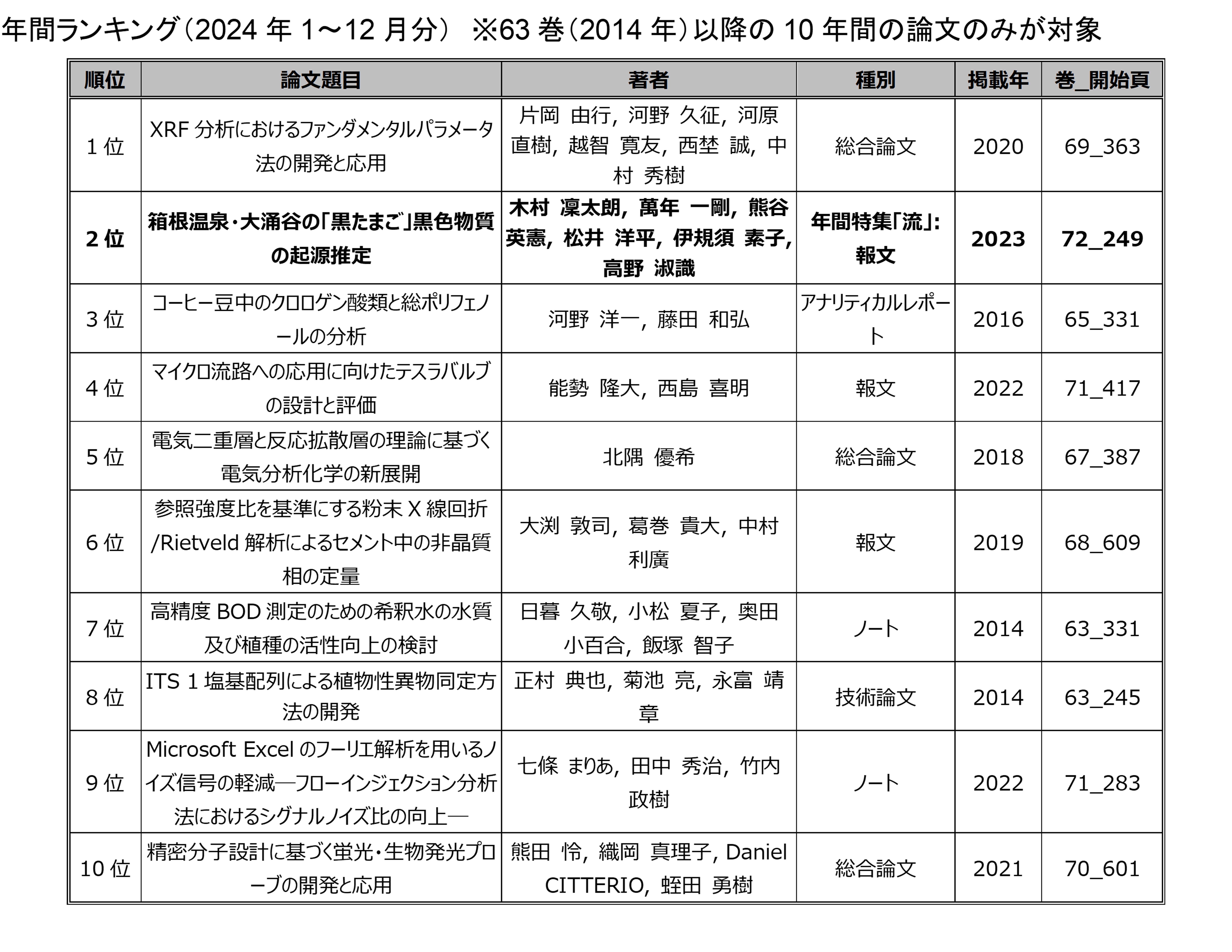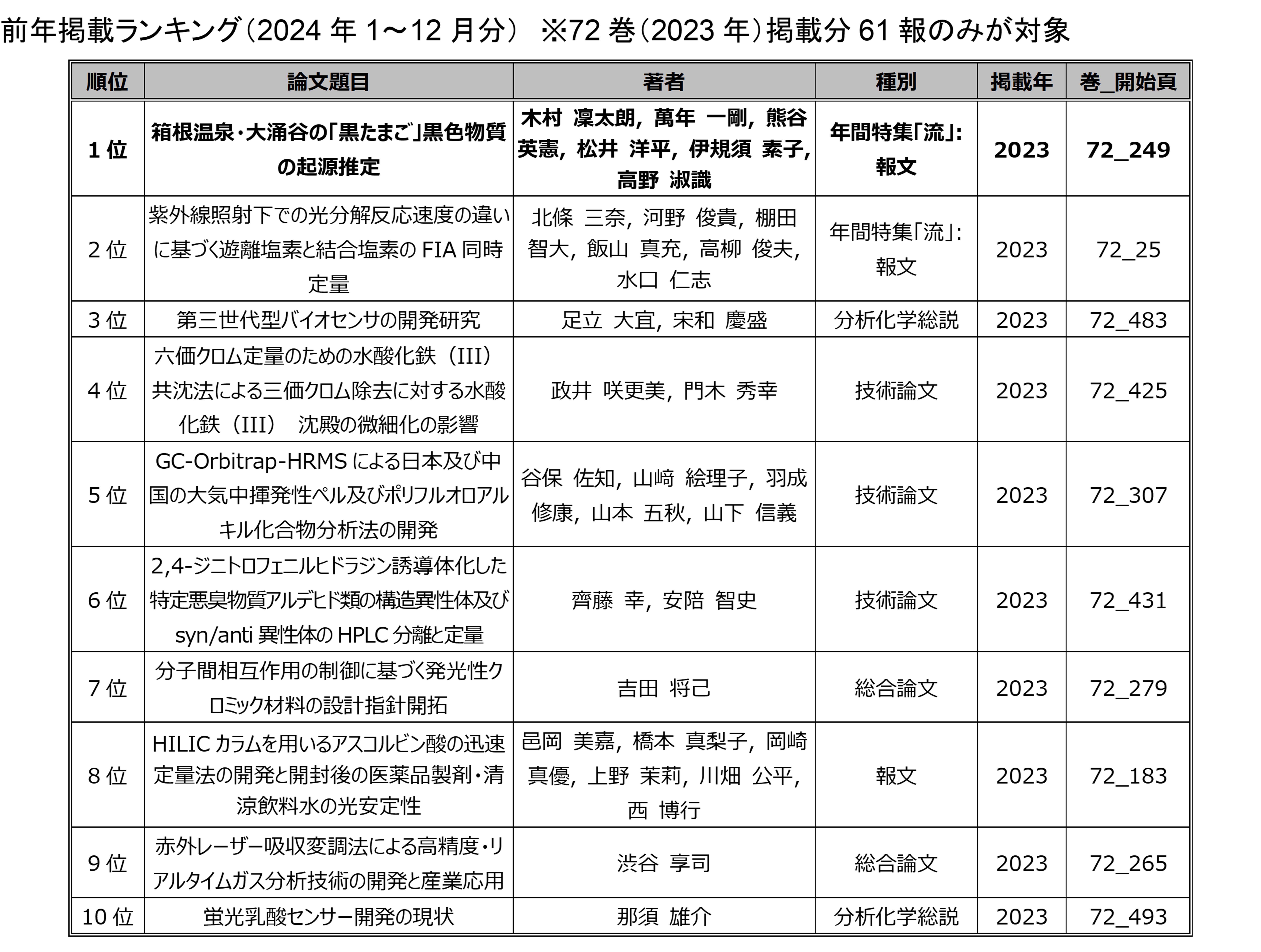 ここでのランキングはJ-Stage「分析化学」のホームページに掲載されているもの とは集計方法が異なりますので結果が異なっています.このランキングはアクセス数を水増し するために同じサイトから何度もアクセスしたり、PDFダウンロード時にネット上の遅延など で複数回ダウンロードボタンをクリックしてしまい、結果として複数回ダウンロードして しまうなど、過剰回数のアクセスによる"アクセス数増大"を防ぐため、一月あたりの 一IPアドレスからは1論文1回のアクセスを上限としてカウントしています.