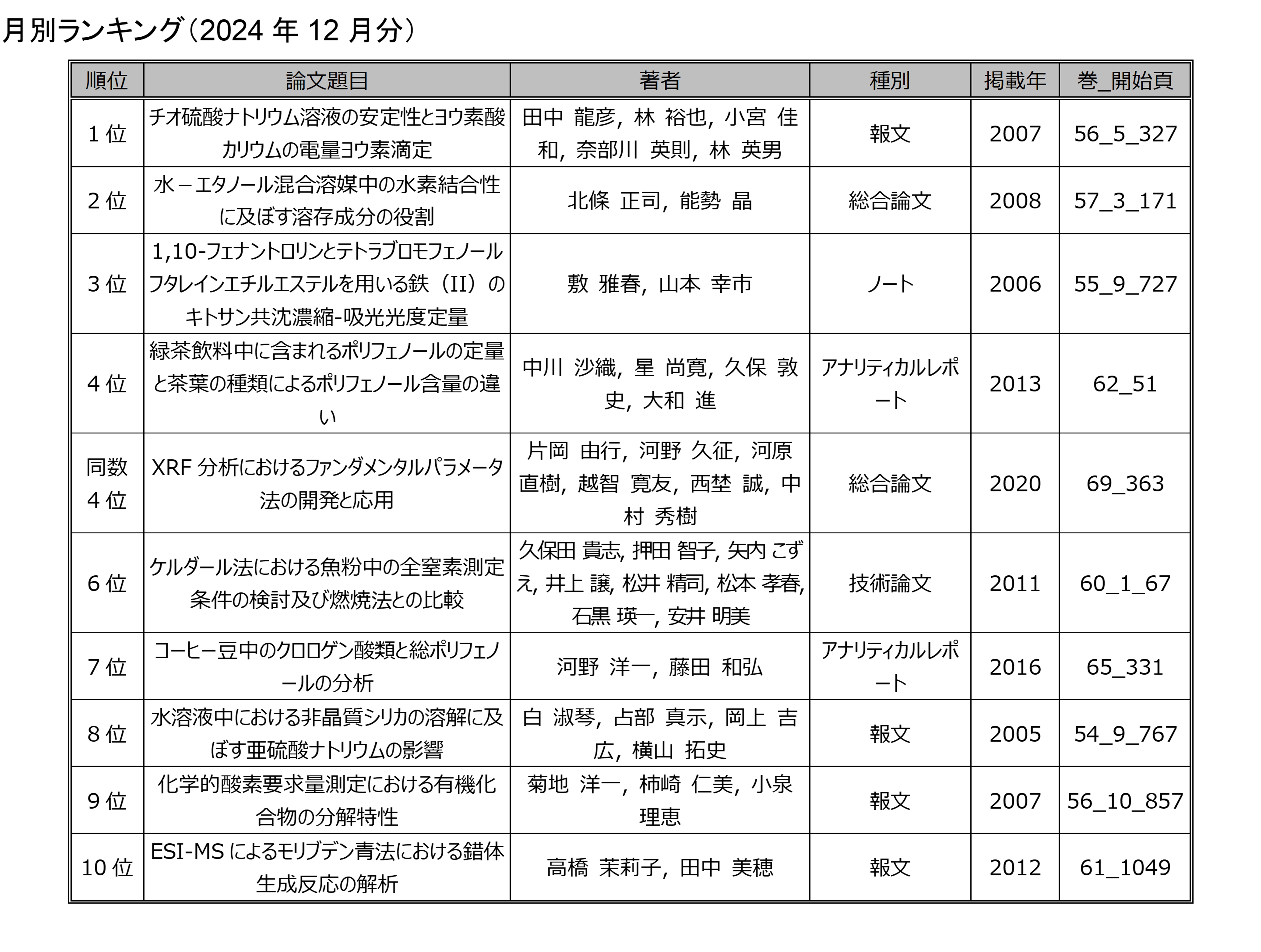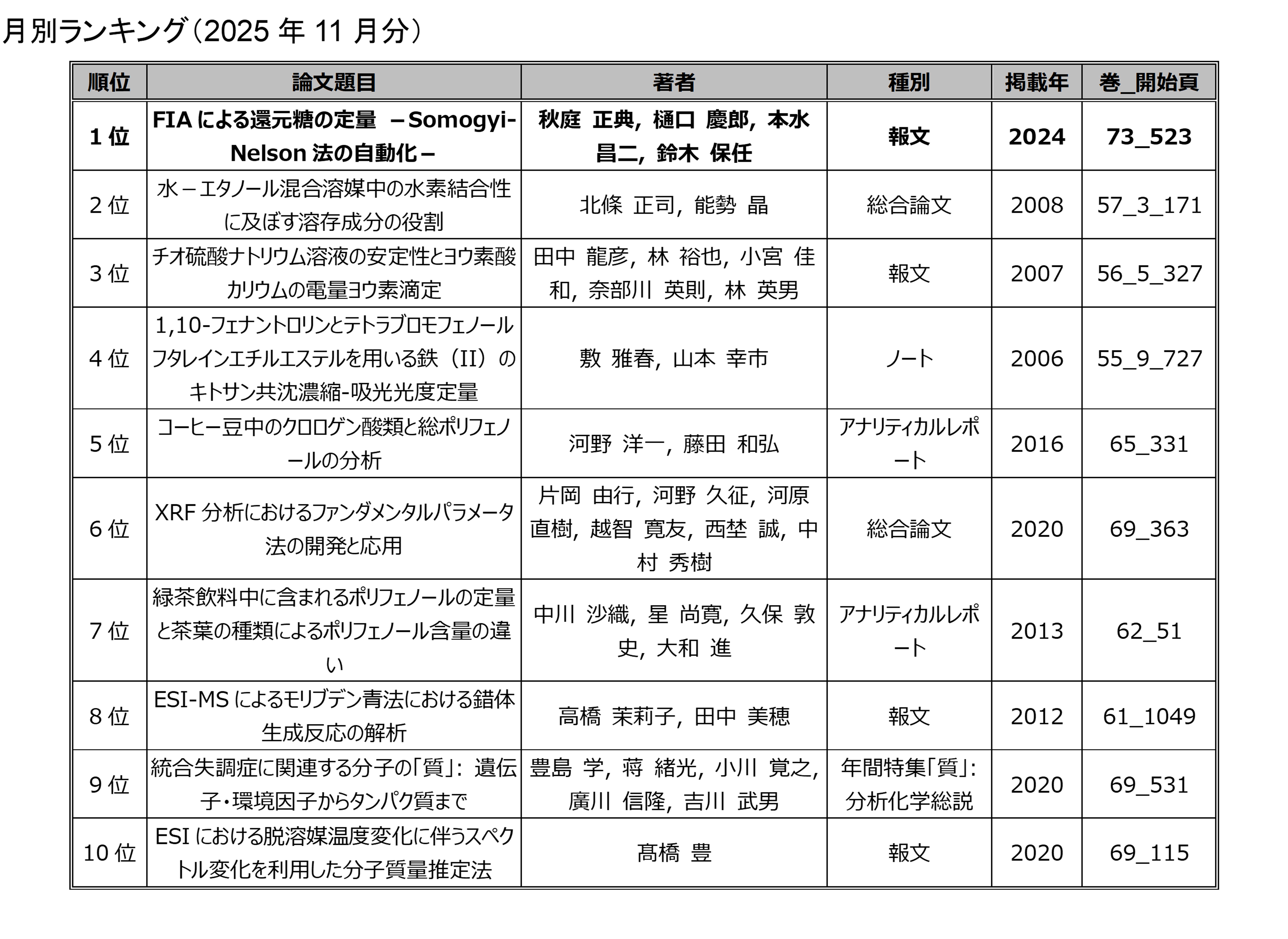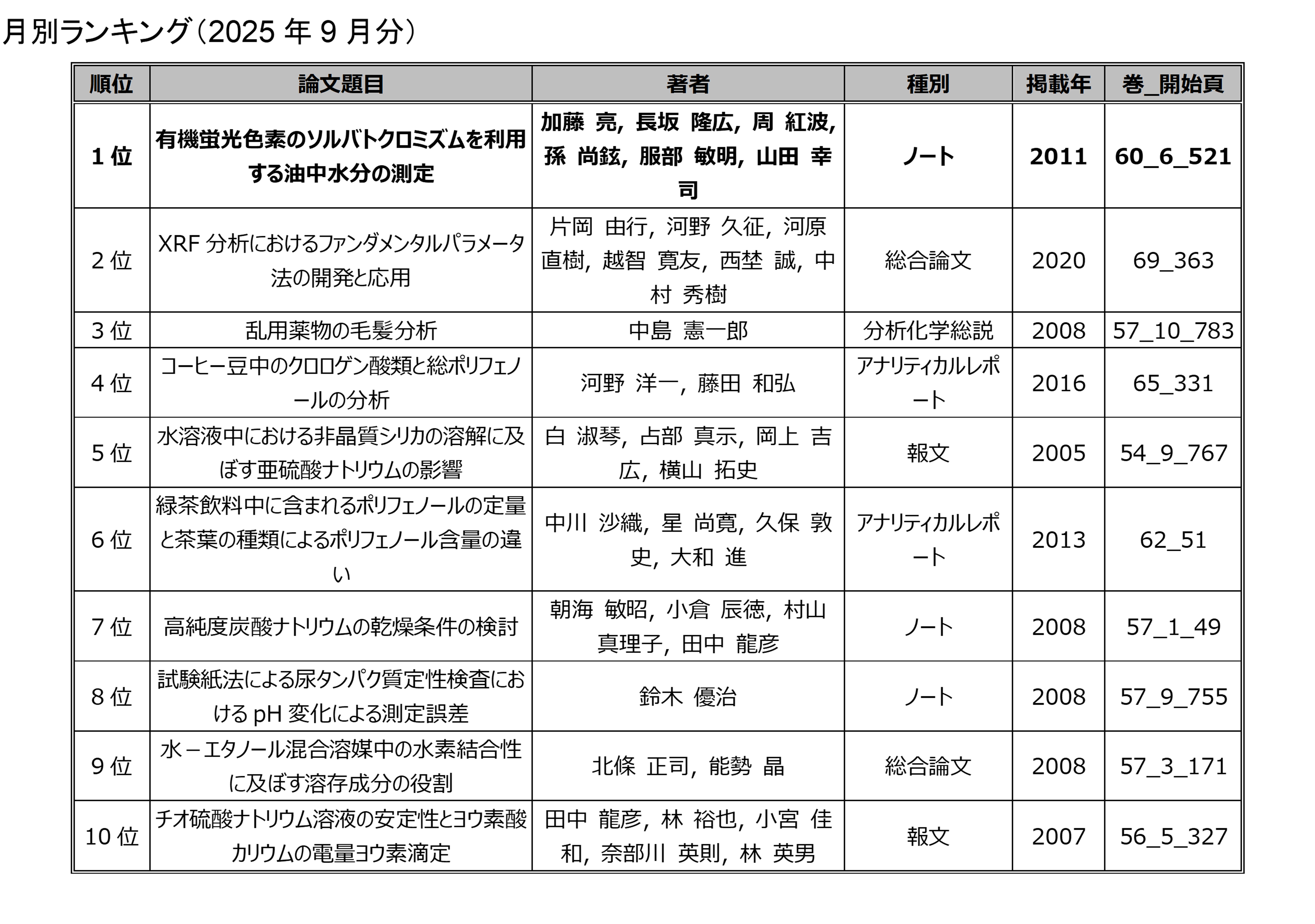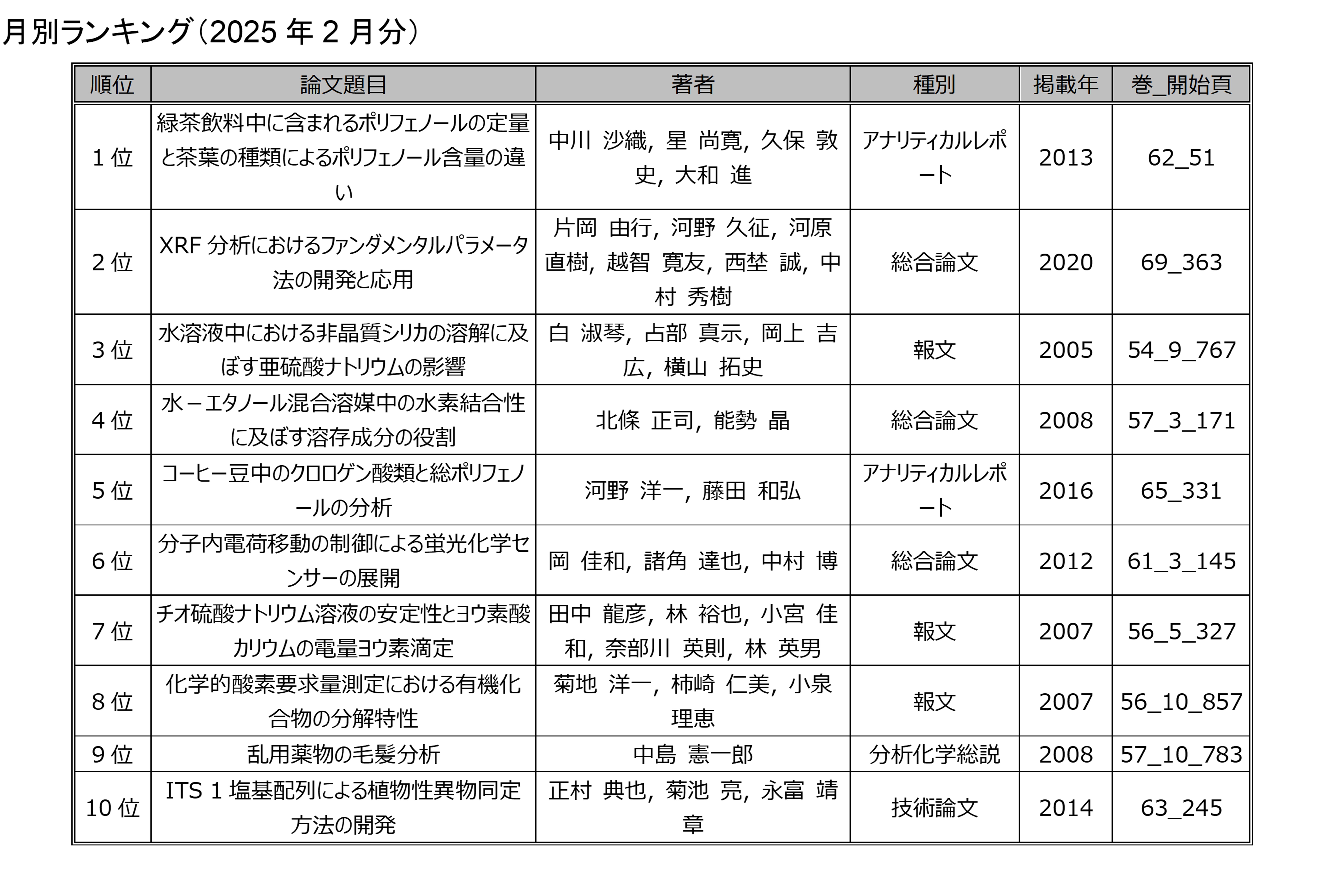 「分析化学」の電子ジャーナルにアクセスした回数を論文毎に毎月集計したランキングです.