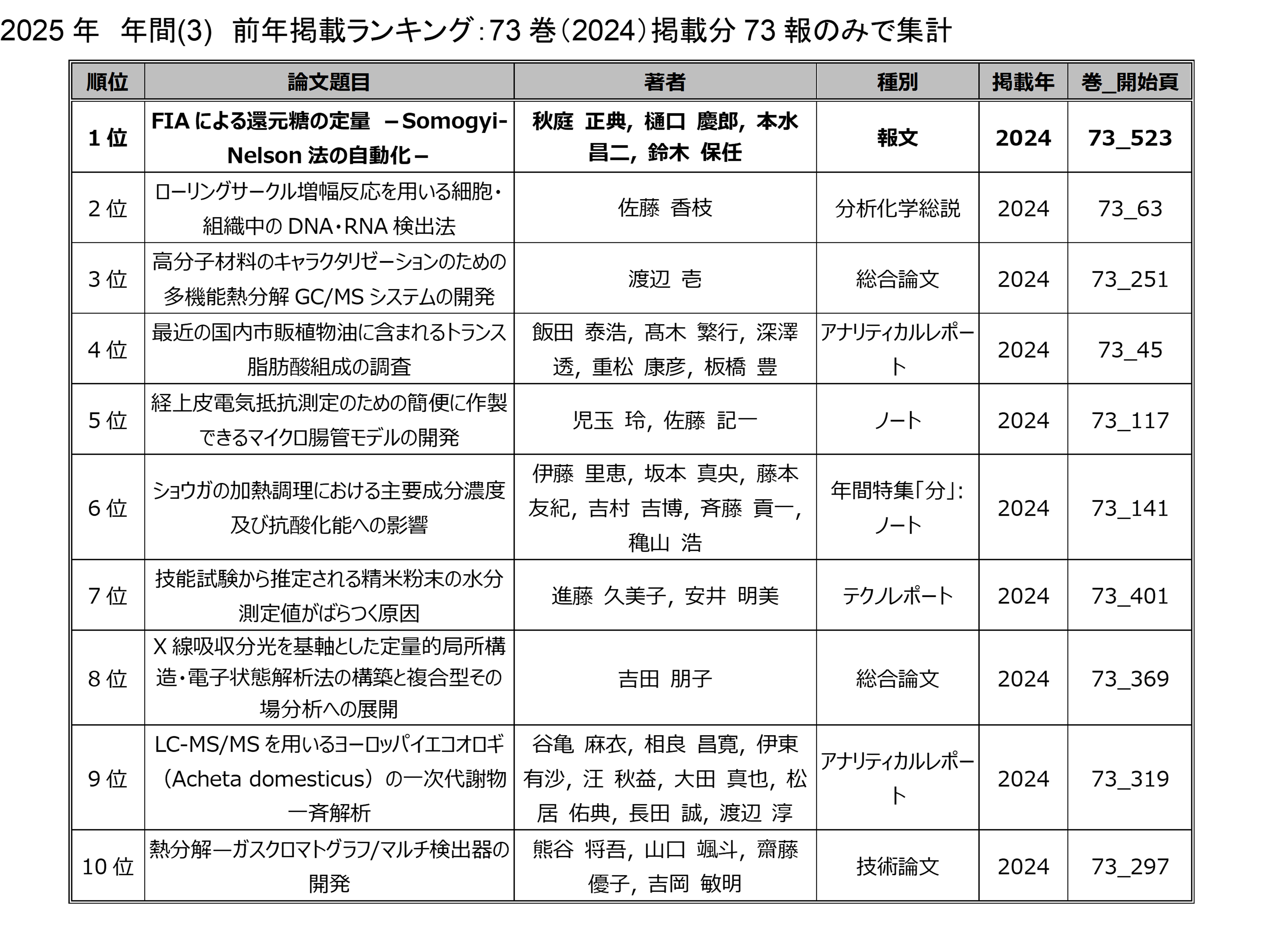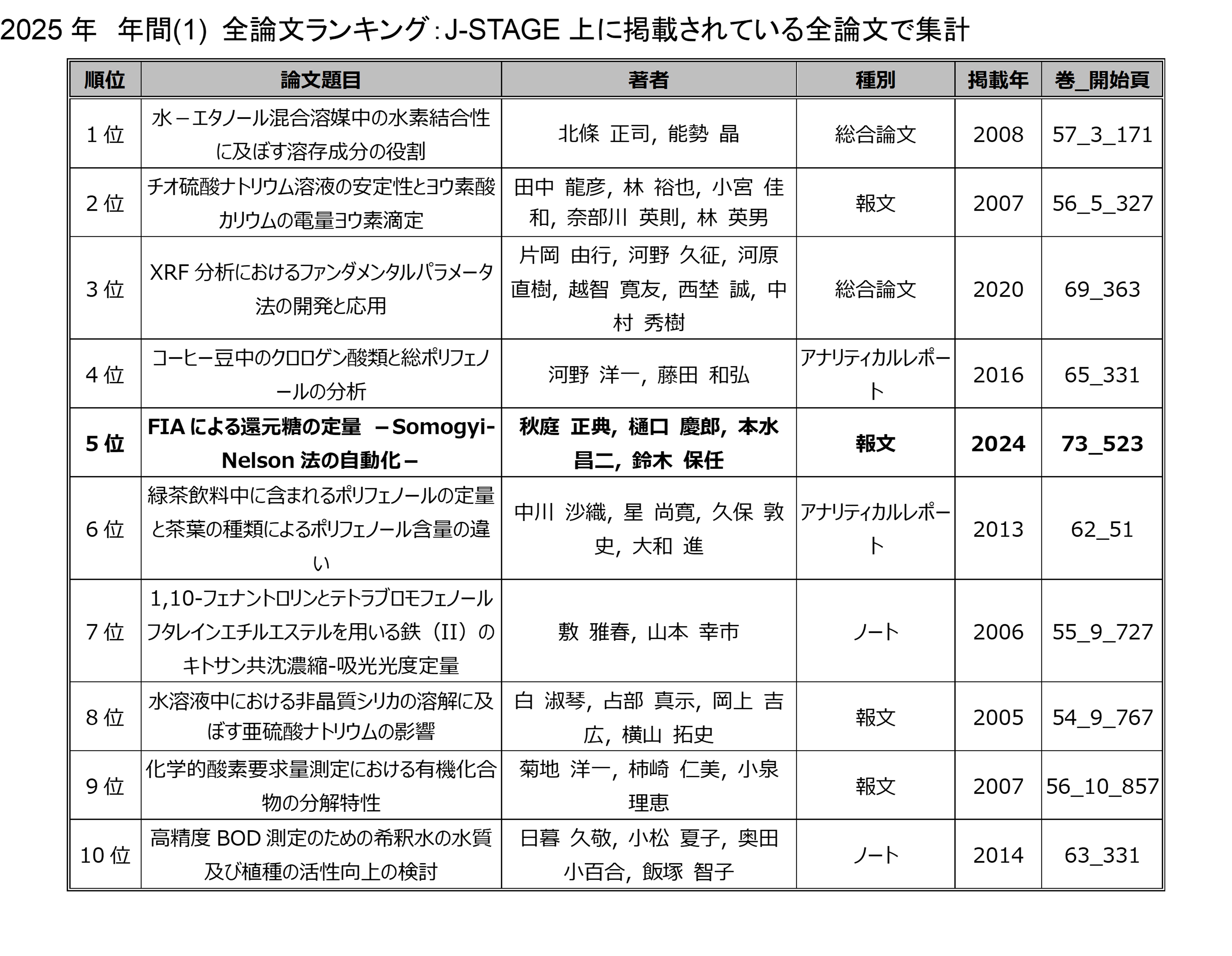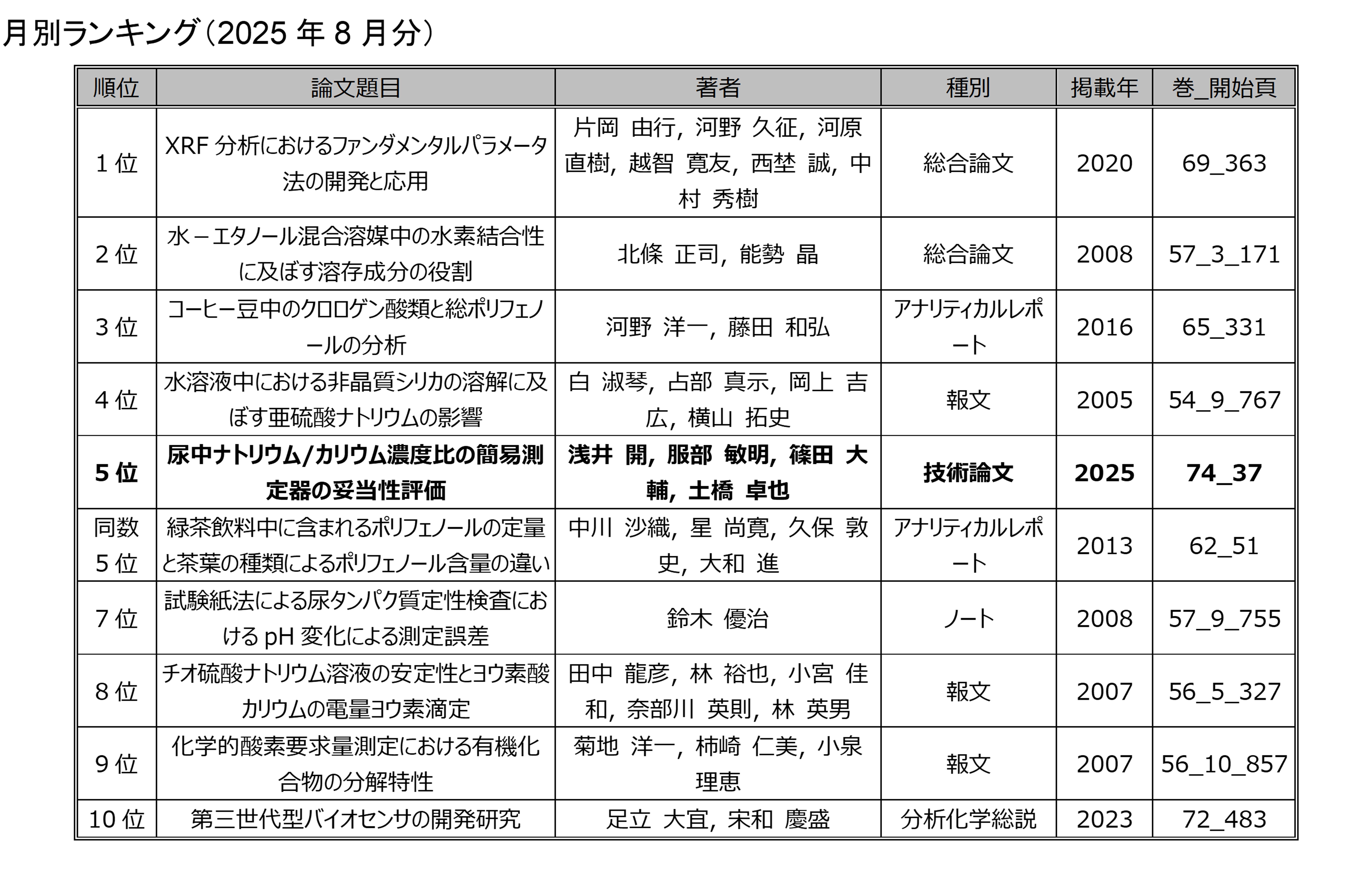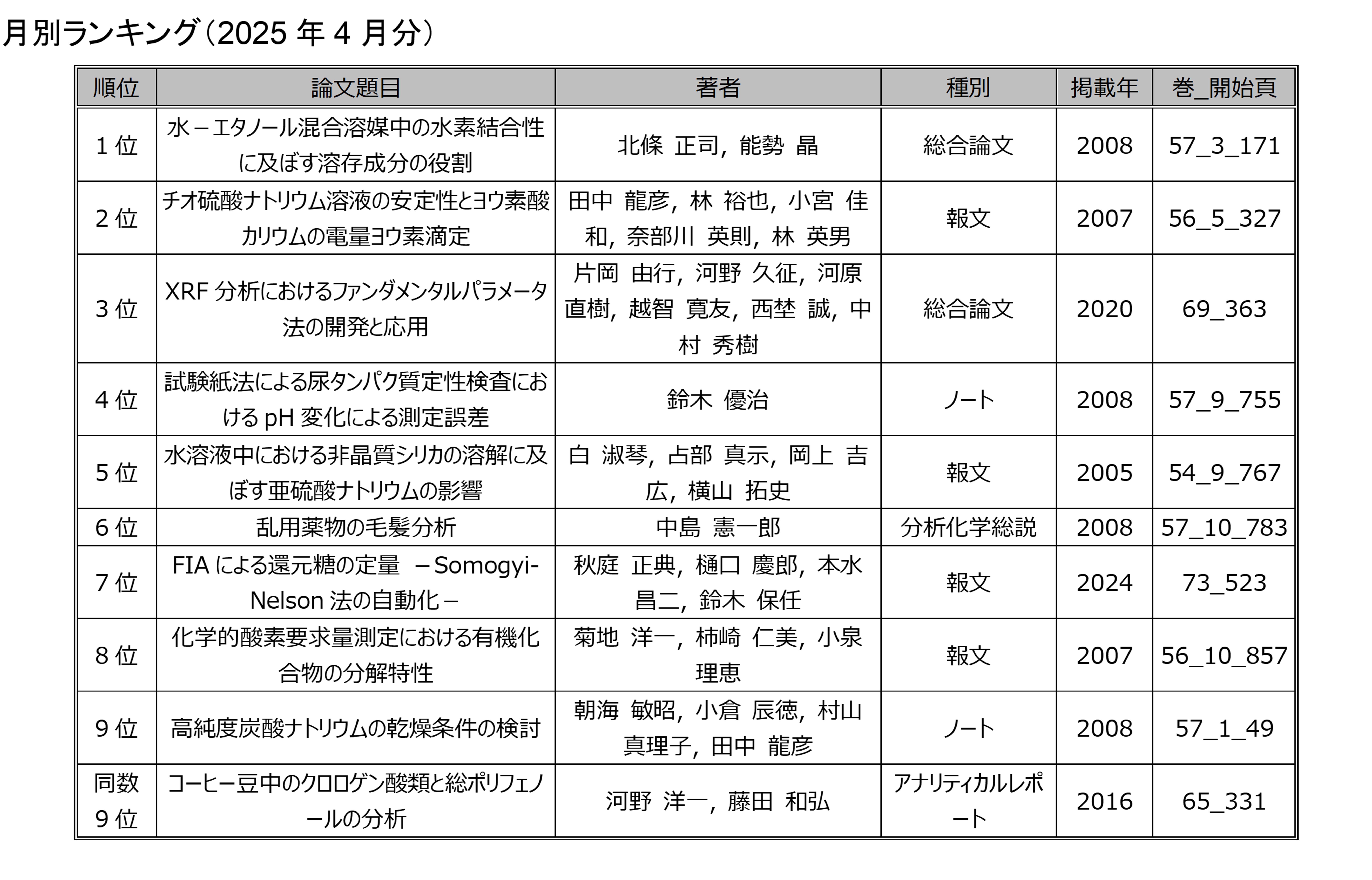 「分析化学」の電子ジャーナルにアクセスした回数を論文毎に毎月集計したランキングです.